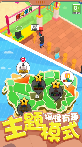 4、六大主题区域循序渐进解锁,每个区域都配有专属的建筑风格、背景音乐和特色游乐项目。