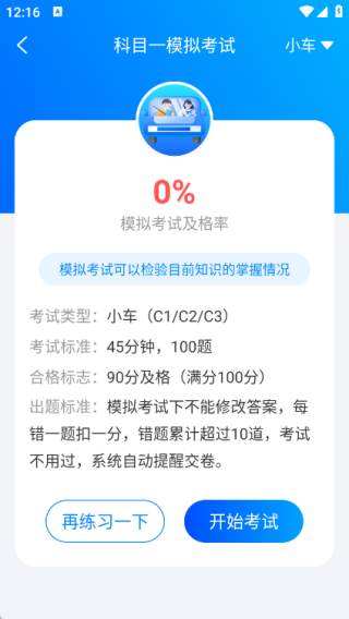 1、在考试页面的科目一页面,有开始练习、精选500题、模拟考试、难题攻克、车辆图解及交通标志等版块。