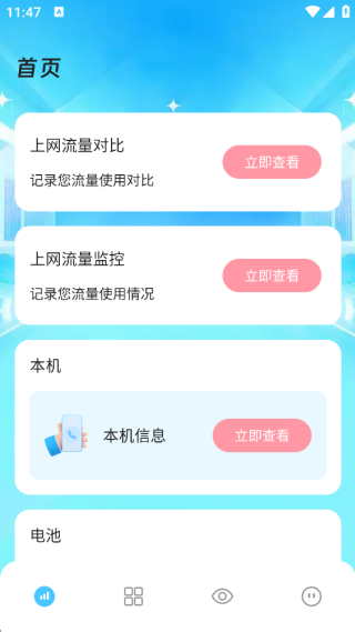 1、进入软件首页就是会把这个月的流量和上个月的使用情况做比较,此外关于本机的所有信息都能在这里进行展示;