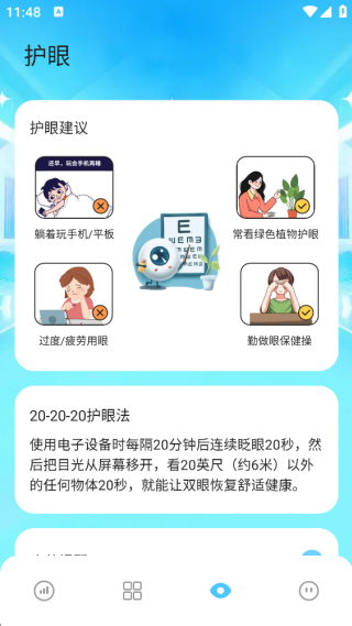 3、护眼栏目这里会给出一些针对性的建议,告诉用户平时生活中哪些地方时需要注意的,小心损伤眼睛,同时还会告知哪些是有益的行为;