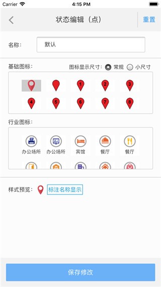 在地图上选用多种图标风格标记兴趣点(机构、业务网点、目标处所等)的位置,可分组、分类,并可输入文字、数字等属性信息。