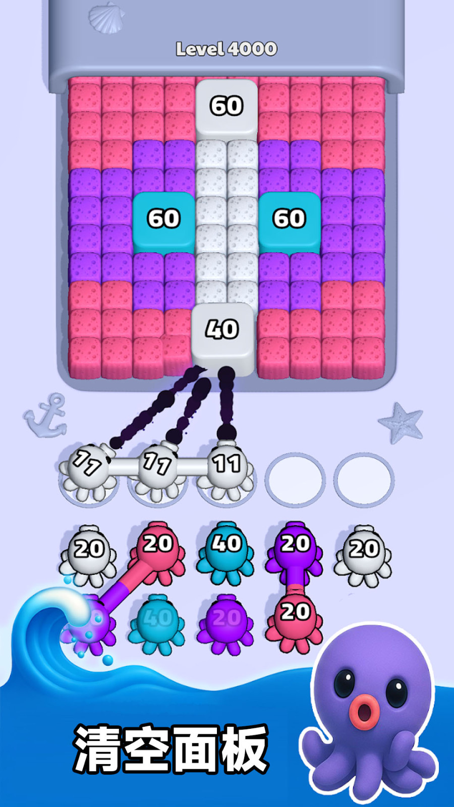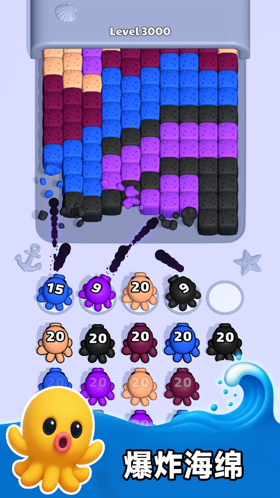 4、最后选用蓝色章鱼,注意章鱼身上的数字,其代表可消除的海绵数量,合理规划确保高效消除。