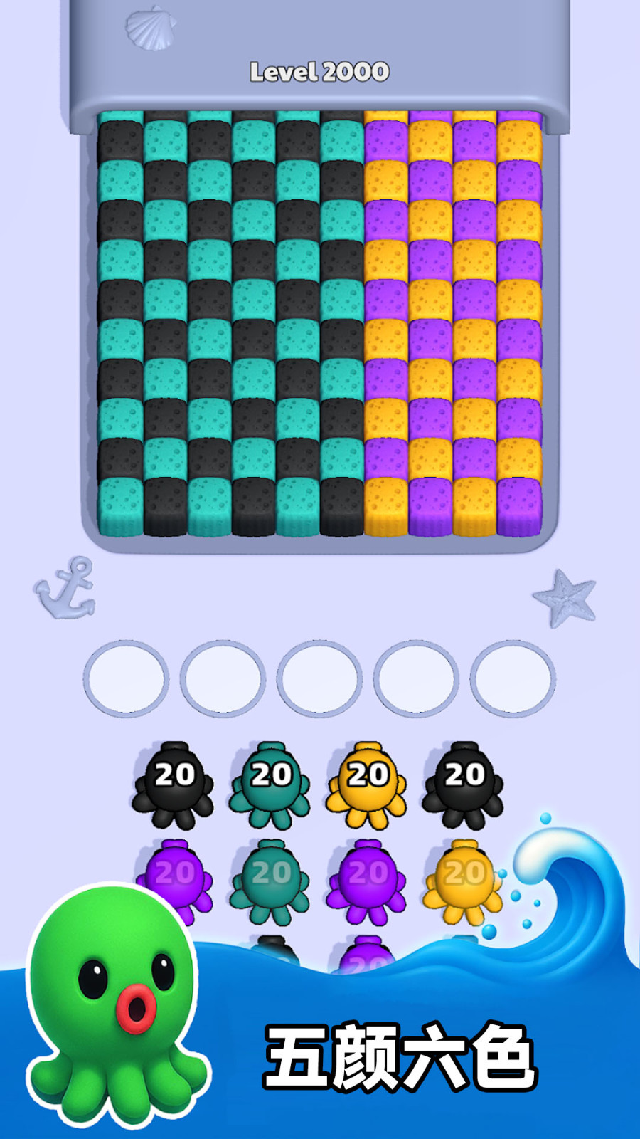 1、操作前先观察场上海绵布局,按照消除效率最高原则选择章鱼,减少墨水(步数)浪费。