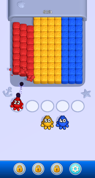 2、仔细观察章鱼与海绵的颜色,优先选择红色章鱼,瞄准并发射墨水击中红色海绵,完成初步消除。