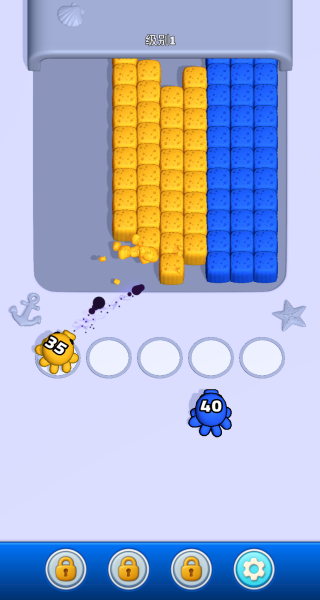 3、红色海绵消除后,再选择黄色章鱼,逐一瞄准黄色海绵发射墨水,持续推进消除进度,感受减压过程。