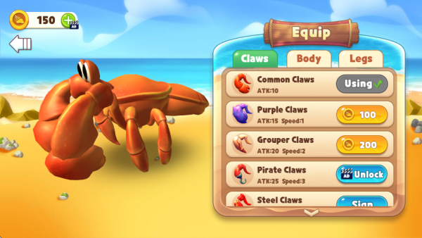4.在equipment界面中,玩家可以购买各种道具,用以升级螃蟹的各项战斗力,从而在竞技对决中拥有更多优势。
