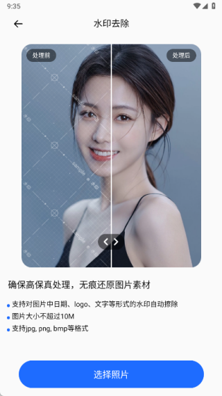 1、上传带水印的图片后自动识别水印区域,选择“智能擦除”就能无痕去除,还能手动微调处理边缘瑕疵。