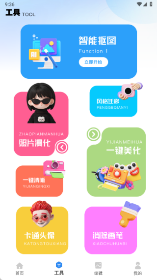 3、在工具中提供智能抠图、图片漫化、一键美化、一键清晰、卡通头像和消除画笔等功能;