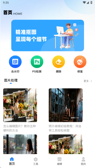 1、在首页中提供去水印、PS检测、擦除、修复,以及图片处理功能;