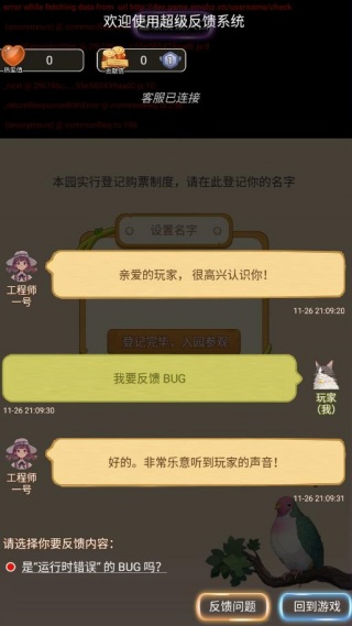4、最后在跟工程师对话,清晰反馈遇到的异常情况,耐心等待修复完成后,点击回到游戏解锁更新后的内容。