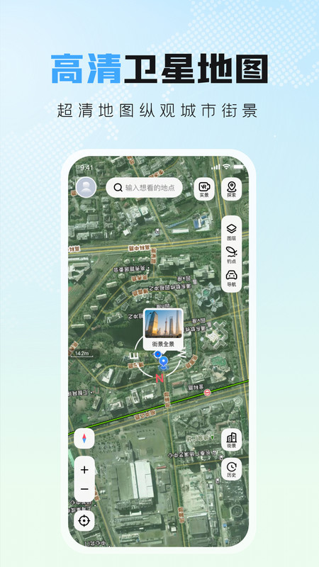 1、输入地点名称或定位当前位置,切换至卫星模式就能查看超清实景影像,连街道旁的树木、建筑细节都清晰可见。