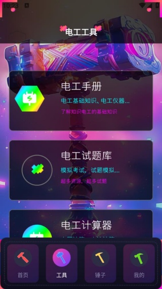 2、点击工具,进入到电工工具学习中,有电工手册,电工试题库提供。