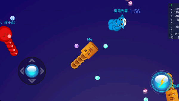 3、在地图中灵活穿梭,避开四周墙壁等致命障碍,寻找并吞噬比自己小的贪吃蛇,实现快速成长。