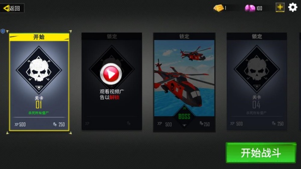 2、从第一关起步,领取并熟悉目标任务,如击杀指定数量僵尸,做好武器装备准备。