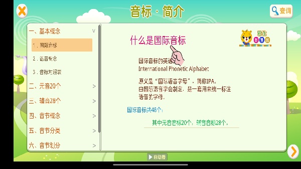 英语国际音标是一款以为各位用户提供英语音标方面学习的学习类软件,用户可以通过该软件里的国际音标知识来进行学习,软件内的所有音标发音均由最标准的真人发音录制的,发音均鸭子清楚、标准且清晰。用户可以在该软件里轻松学习音标。