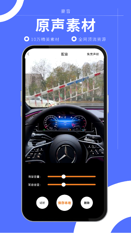 2、内置配音功能,可自由调节背景音量与配音音量,试听满意后保存本地。