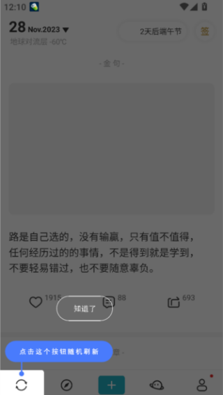 1、点击界面左下角的按钮,可以随机刷新当前页面内容,系统将自动推荐新的语录或短文。
