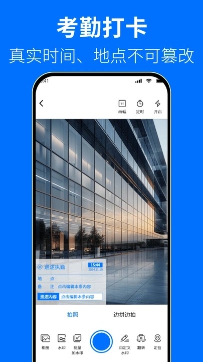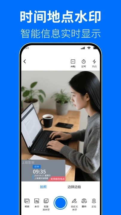 2. 一键获取当前时间地点作为水印:可以帮助用户拍照打卡。
