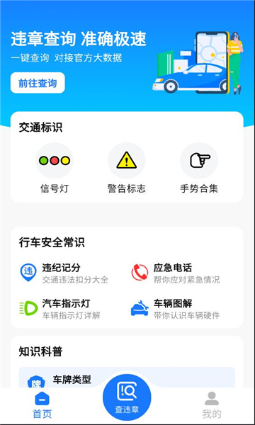 2、首页提供了交通标识和行车安全常识、知识科普等多种功能。