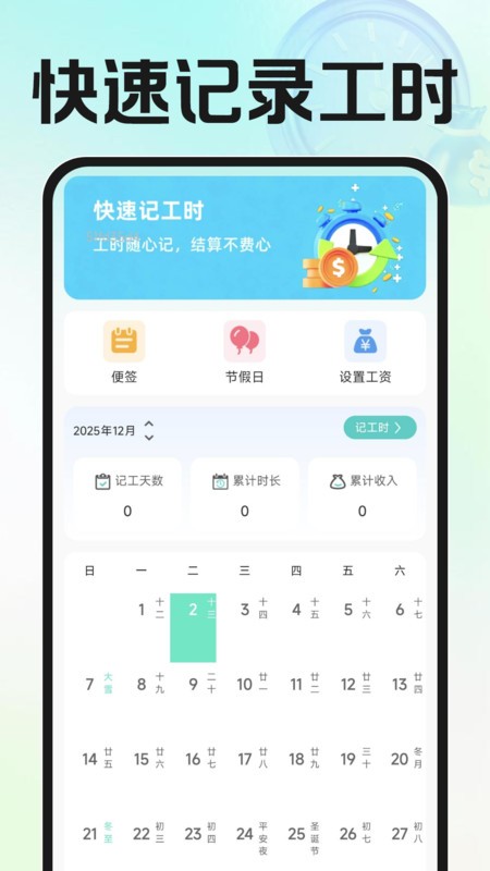 1、该软件可以进行记工时和查工资,所有数据根据用户的记录进行更新;