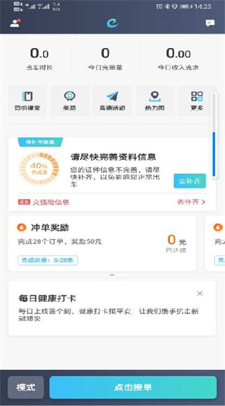 3、在APP首页点击“上线”或“开始接单”按钮,进入听单状态,系统会自动推送附近订单。