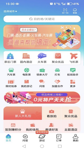 1、首页带来了景区门票、国内酒店、火车票、聚众优品、飞机票等服务板块;