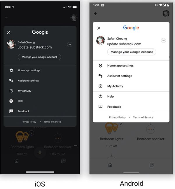 要为 Google Home绑定流媒体服务,本质上仍然是需要为你当前使用的 Google账户绑定流媒体服务;这一过程无论在 iOS还是在 Android平台上实际体验都非常相似:在配套应用 Google Home中,点击右上角的头像,选择菜单中的「Google助理设置」(Assistant settings),并在展开的页面中选择「音乐」(Music)一项即可进入到绑定音乐串流服务账号的界面。