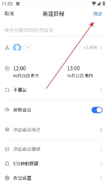 3、在新建日程页面,确认填写的会议信息无误后,点击右上角确定按钮,完成会议预约操作。