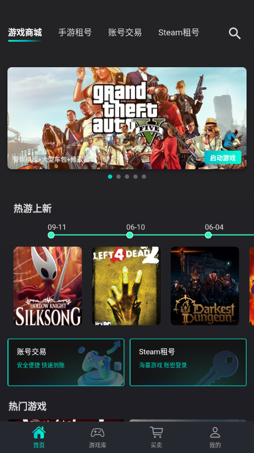 2、首页可以看到各种功能,如:租号、海量的游戏、交易等;