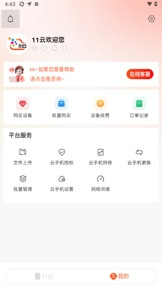 4、我的这里则是可以和客服沟通,还有云机板块相关的管理,包括文件上传、云机授权和更换等功能,!