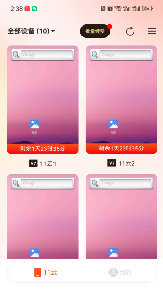 3、例如这里有10个设备,会提示还有多久过期,批量一起续费等等,每个云机都有单独的名字方便用户查找;