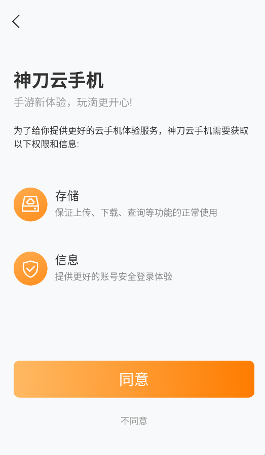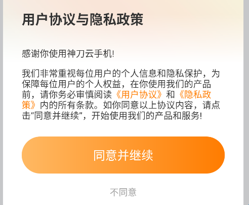 1、本站下载并打开神刀云手机app,点击同意并继续;