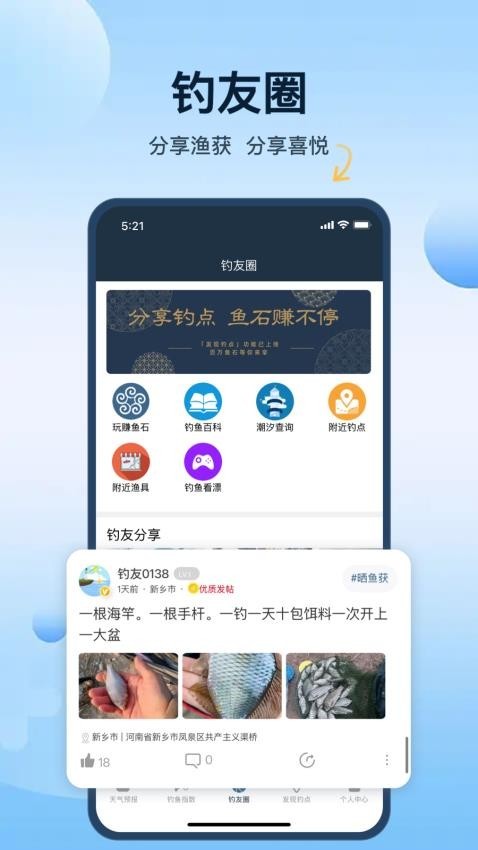 1、钓鱼天气预报与钓友们一起分享鱼获,交流钓友技巧。