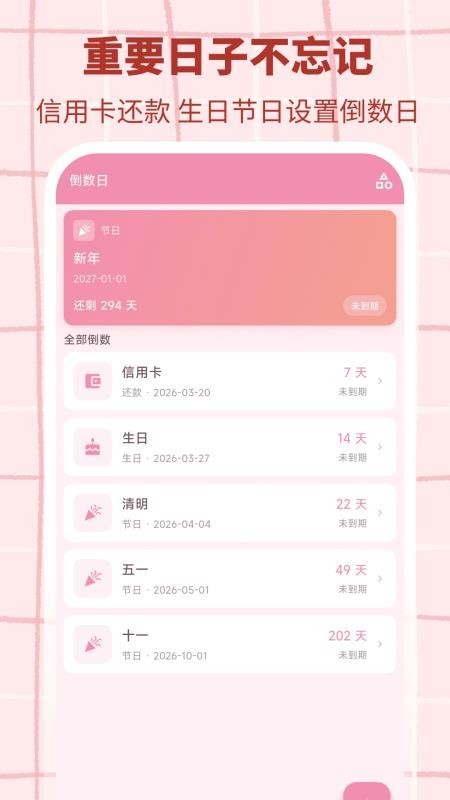 支持用户自定义编辑添加重要日子,并能自动实现倒计时,知道距离日子天数更方便;