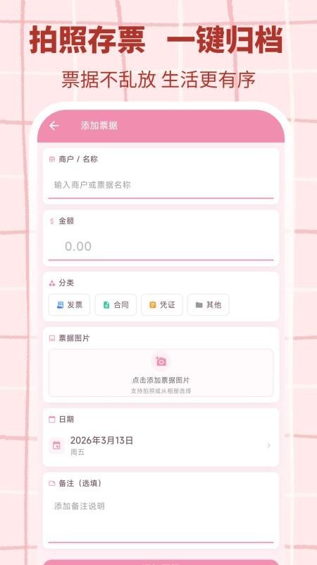 强大的拍照功能,可直接通过拍照的方式记录发票以及合同等发票,方便管理;