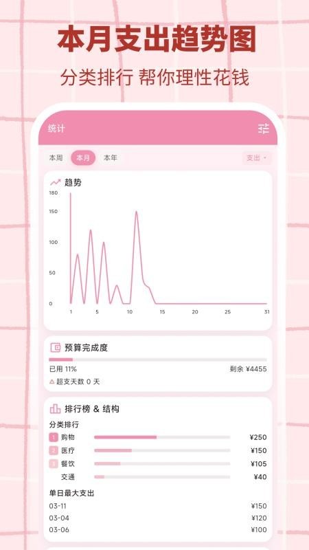 记录的账单可自动实现统计,并生成趋势呈现,帮助你知道支出更加直观;