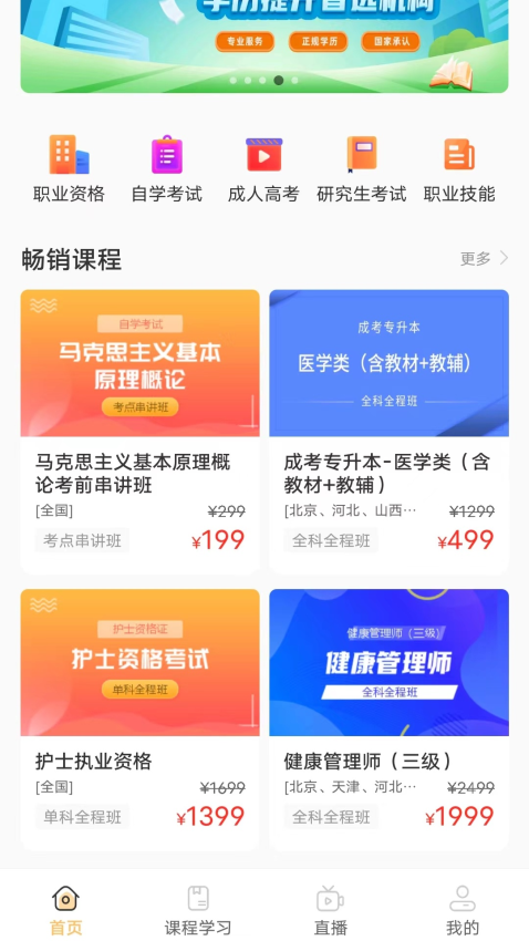 将课程分类为职业资格、自学考试、成人高考、研究生考试、职业技能等多种类型。