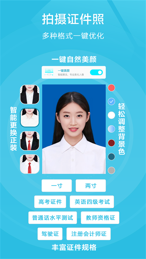 2、内置多种官方认可的证件照尺寸模板,可实时更换背景色并智能美颜。