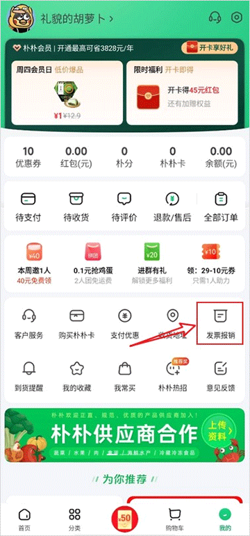 朴朴买菜app怎么开发票