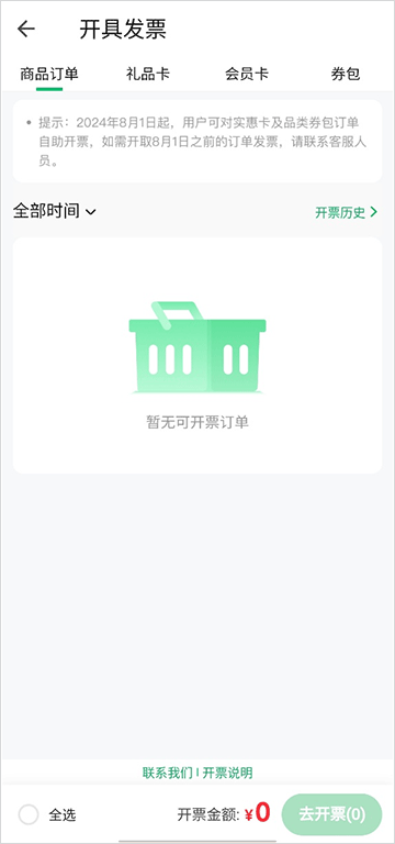 3、在历史订单中找到要开发票的项目,点击“去开票”