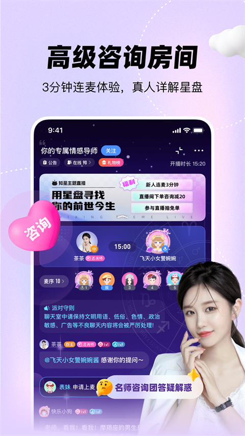 支持多人语音聊天室,用户可加入感兴趣的主题房间(如情感倾诉、星座讨论)实时互动。