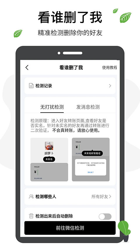 2.看谁删了我:快速检测出已将您删除或拉黑的好友名单,操作简单直观,支持对识别出的联系人进行备注或直接移除,成为您管理微信好友的得力助手;