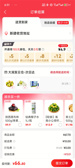 大润发优鲜是一款生鲜配送app,其配送种类多样,包括水果蔬菜,海鲜水产,肉禽蛋类等等应有尽有,除此之外,部分熟食如面点烘焙也可以买到,直送到家,食材优选,送达迅速是该软件的特色,同时,新用户注册可获得优惠卷,平时也有许多大大小小的优惠活动。