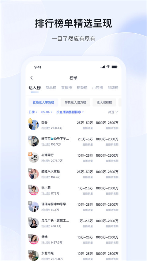 多维度发现优质达人:通过达人历史数据、带货能力、成长趋势等多维度分析,快速对标学习,寻找合作机会。
