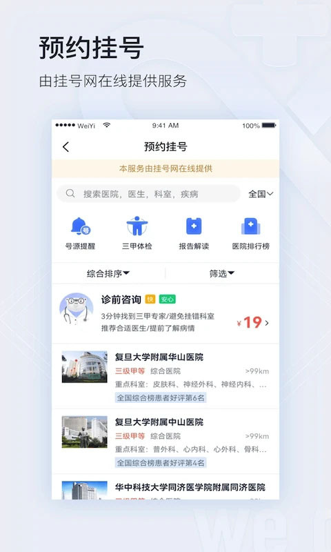 微医app是一款医疗服务类软件,该软件关联了全国上千多家医院,其中不乏三甲级医院,遍布全国多个省份,只需要通过手机号注册后,便能够实现线上挂号,解决挂号排队的烦恼,以及还有医生咨询,智能分诊,院外候诊,病例管理等功能,该软件已经由国家卫生以及委员会说批准,安全有保障。