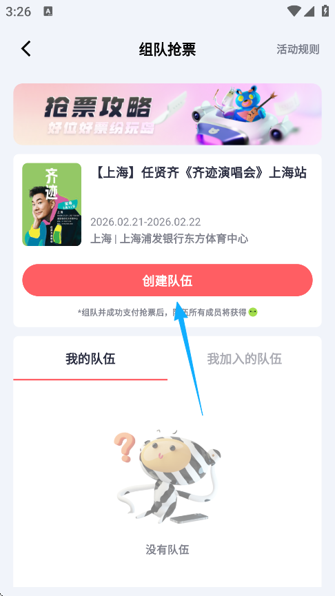 5、创建队伍,与好友组队抢票可以增加抢票的成功率。