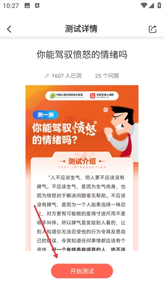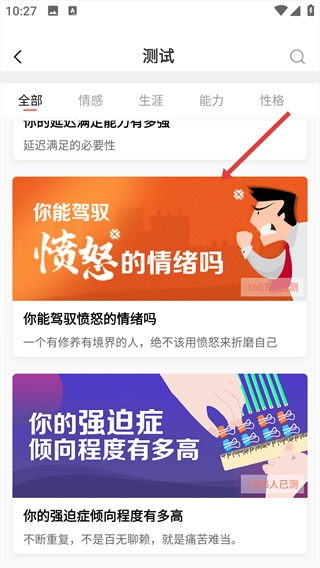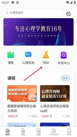 1、先在首页定位到【测试】功能按钮,点击该按钮后,即可进入心理测试板块。