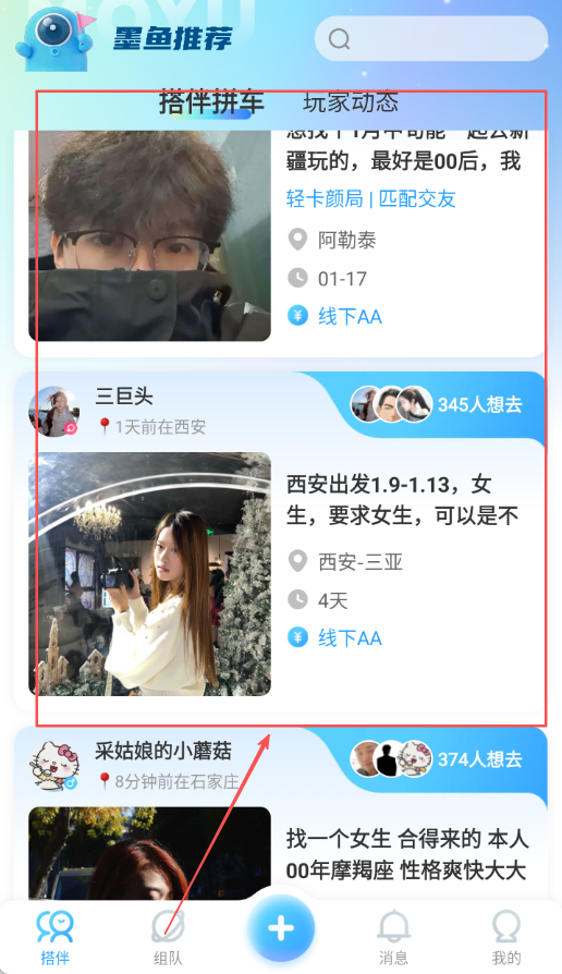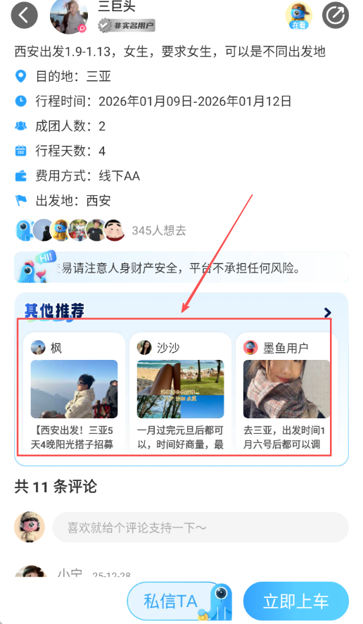 4、在结伴栏目发布包含出发地、目的地及时间的具体行程信息,系统会进行匹配,帮助用户找到同时间同地点的旅伴。