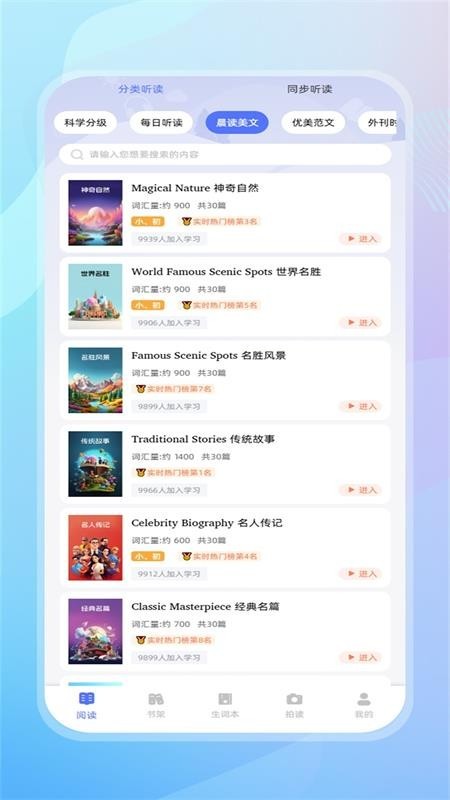 每天都有新的听读学习内容推送,随时都能在线查看和选择内容开始听读学习;