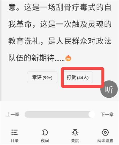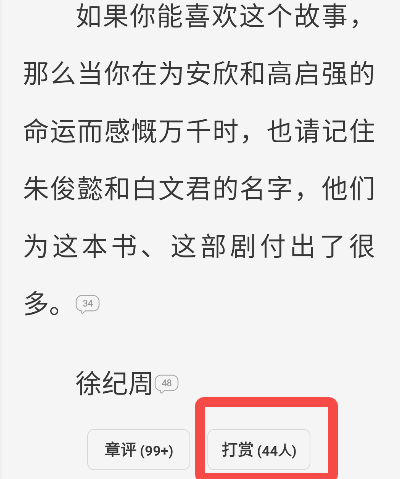 在书籍阅读页每个章节的结尾,会有打赏入口。